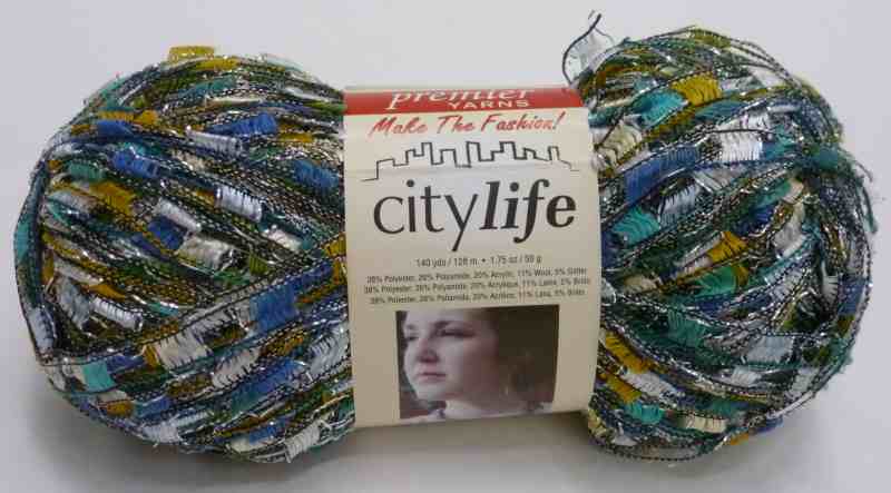 City life is a line we just started carrying. It is a novelty ladder yarn that is great for making jewelry. It is 38% polyester, 26% polyamide, 20% acrylic, 11% wool and 5% metallic – Hand wash and lay flat to dry. There is a jewelry project pattern on each ball band, and we have free jewelry project leaflets for this yarn in the store.