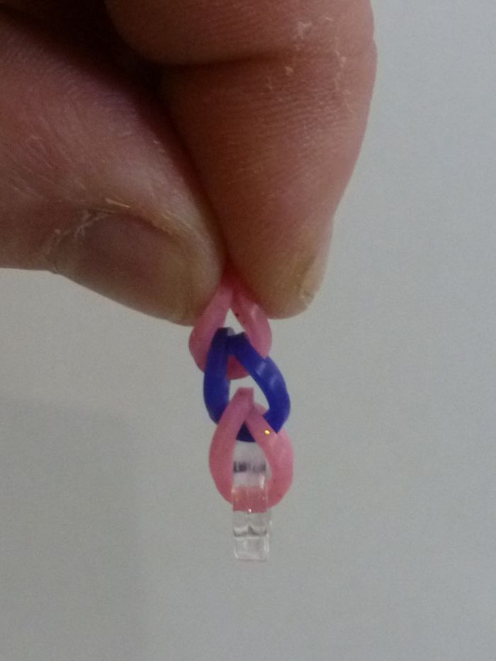 5. Pinch the two free ends of the rubber band together. Pinch a new rubber band in half and insert into the previous rubber band.