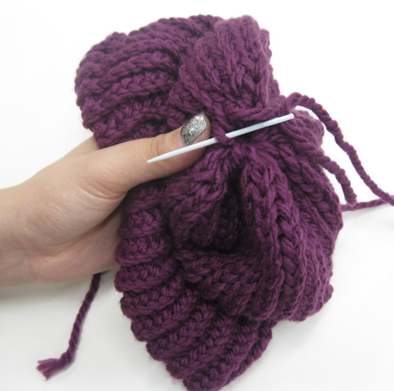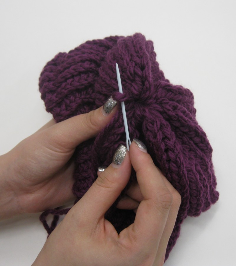 Thread the tail from the beginning of the hat on the needle and weave through the hem. Pull through and cut off the excess tail. Turn the hat right side out.