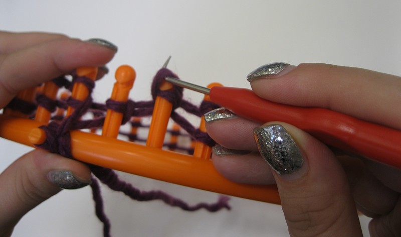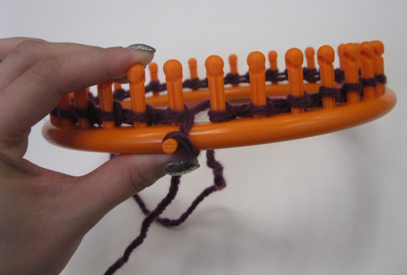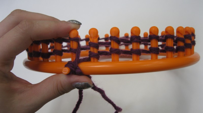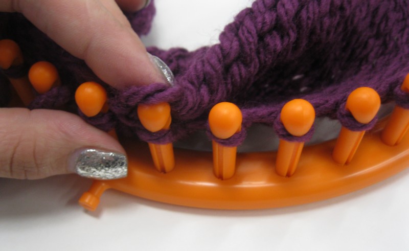 Continue around, putting the loops on the yarn and pulling them off the pegs.
