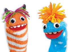 And last (but surely not least) is the Sock Puppet Monsters kit. Everything’s better with monsters, and now you can make your own monster sock puppets with this kit. There are enough pieces in this kit to make two sock puppets – two fuzzy socks, four googly eyes, a plastic yarn needle, four colors of yarn, a cardstock sheet of monster parts, double-sided tape and instructions. Also included are a cardboard scene and script for your first puppet show!