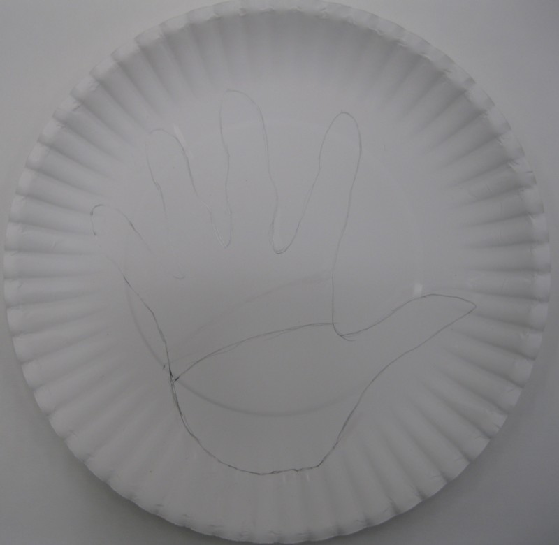 2. Trace your hand on the paper plate. Draw a line across the palm, just above the thumb.