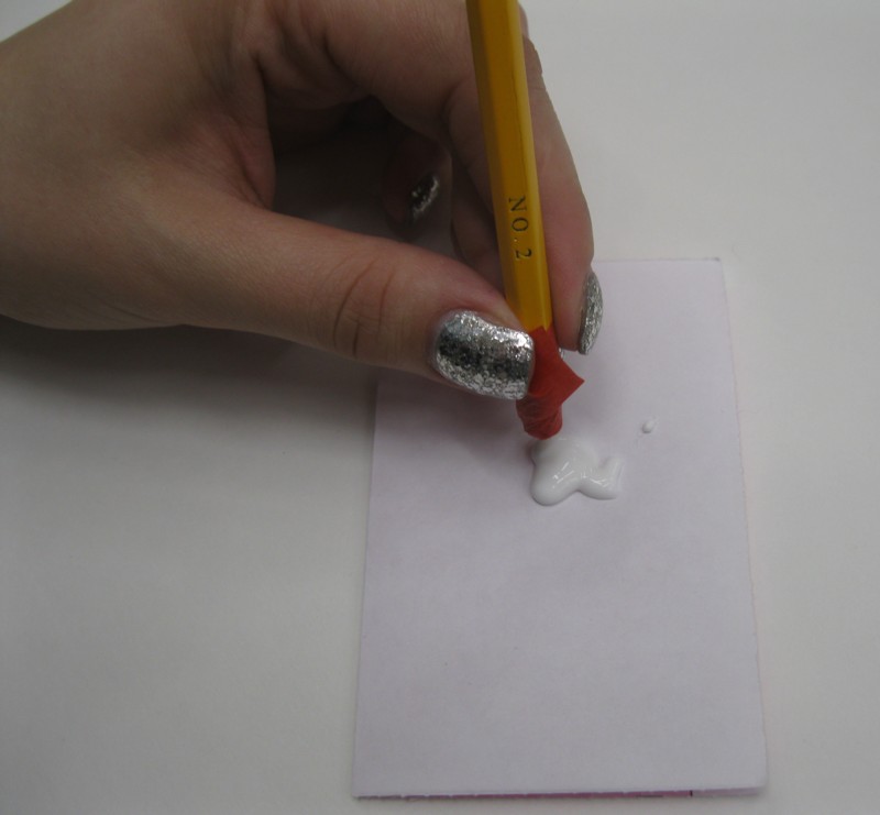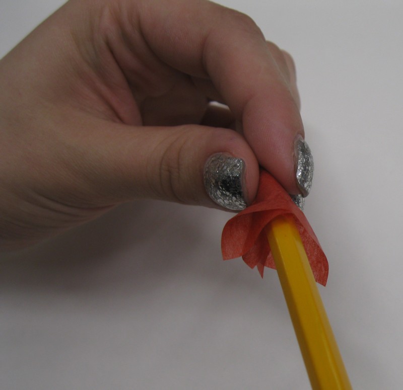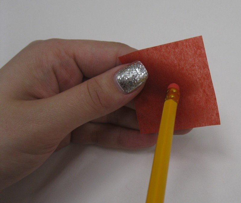 3. Put the pencil eraser in the center of the tissue paper square. Be sure to use the eraser end – using the wood end will tear the paper.