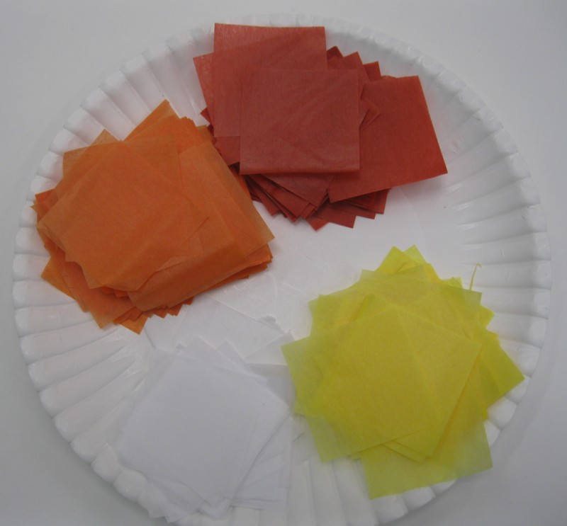 1. Cut the tissue paper into 2″ squares. One sheet of each color is more than enough for one turkey.