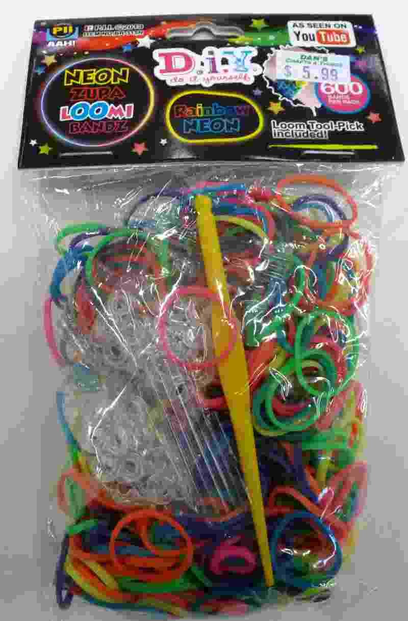 The neon assorted bag contains 600 neon-colored rubber bands, s-clips, instructions and a hook.