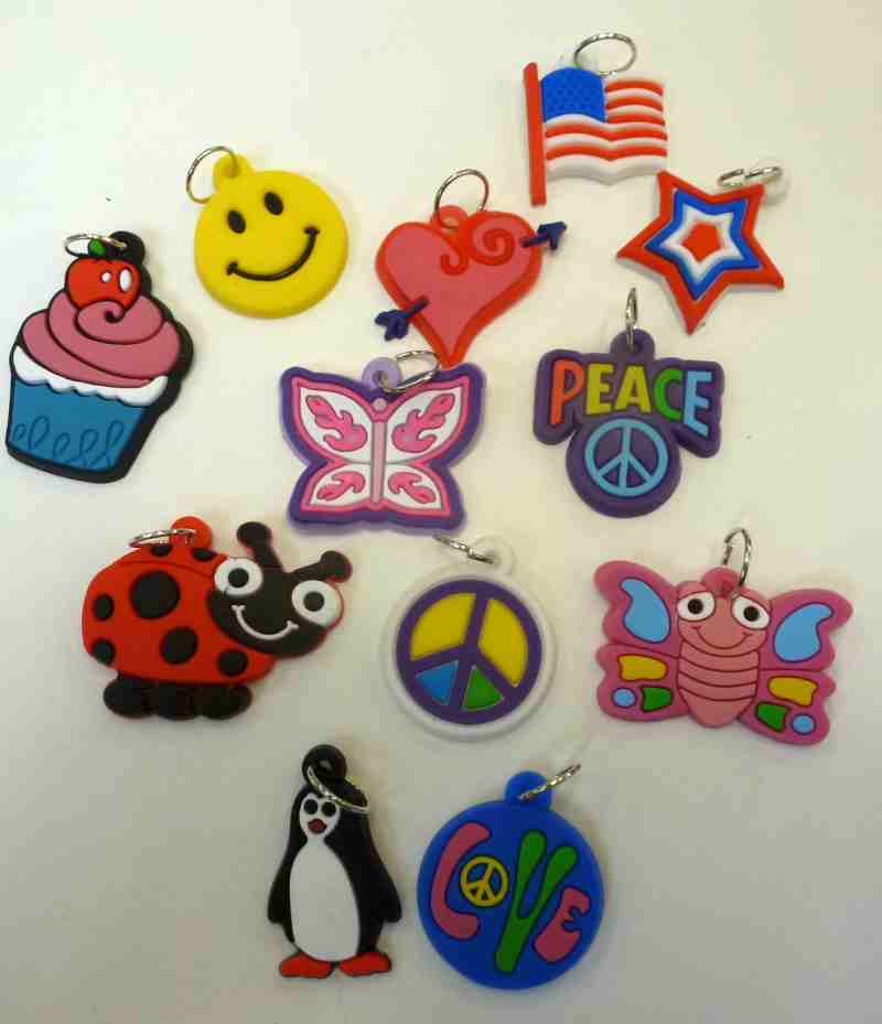The charm set contains the 12 flexible rubber charms pictured. Each charm has one metal jump ring attached.