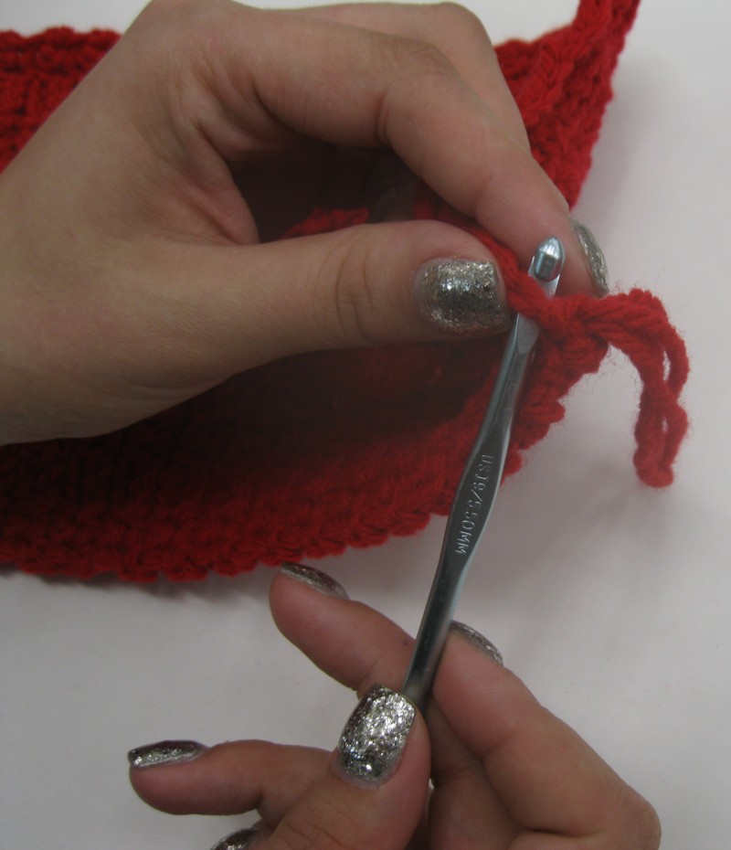 Insert crochet hook into a stitch on the end of the scarf.
