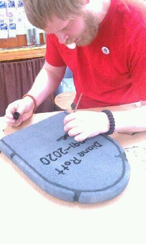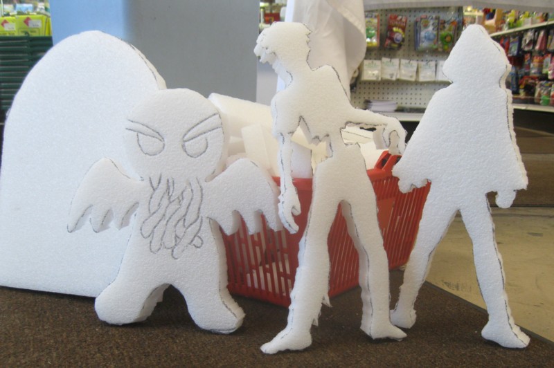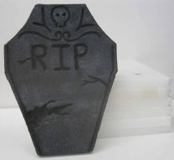 Thanks to many people for helping me get this tutorial together. It’s mostly Maria’s brainchild, and she and Justin did the styro cutting. Maria, Justin and Rebecca all took pictures, and Justin did the painting for the sample tombstone used in this tutorial.