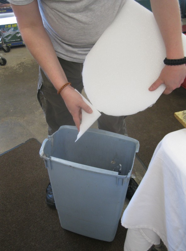 3. Using a scrap piece of Styrofoam, “sand” any rough edges off. This step is messy, so do it over a garbage can as shown, or over some newspaper.